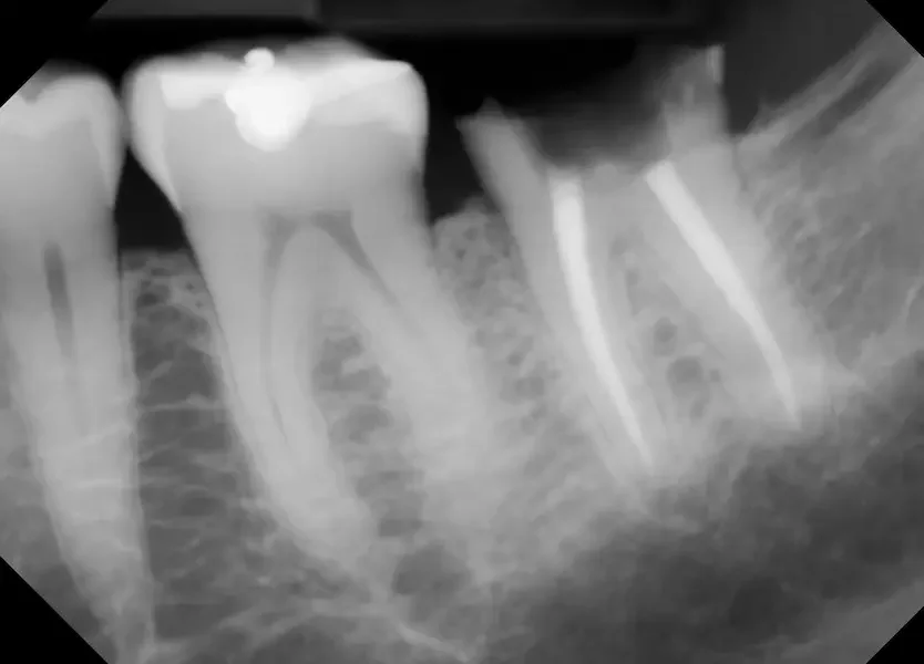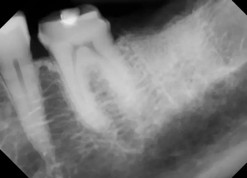 A real patient X-Ray of a tooth needing extraction. There is not enough tooth structure above the gumline to predictably save the tooth!